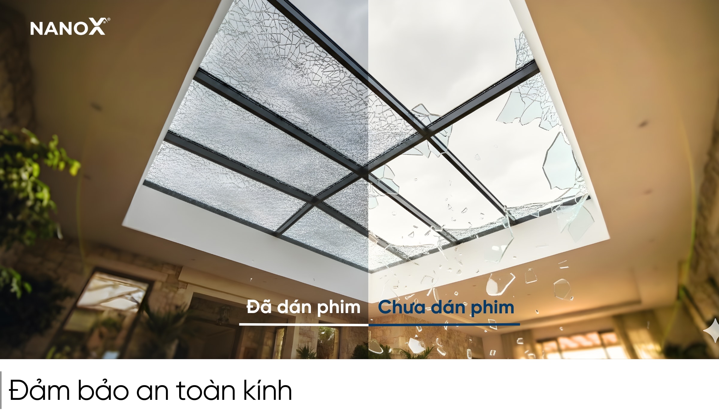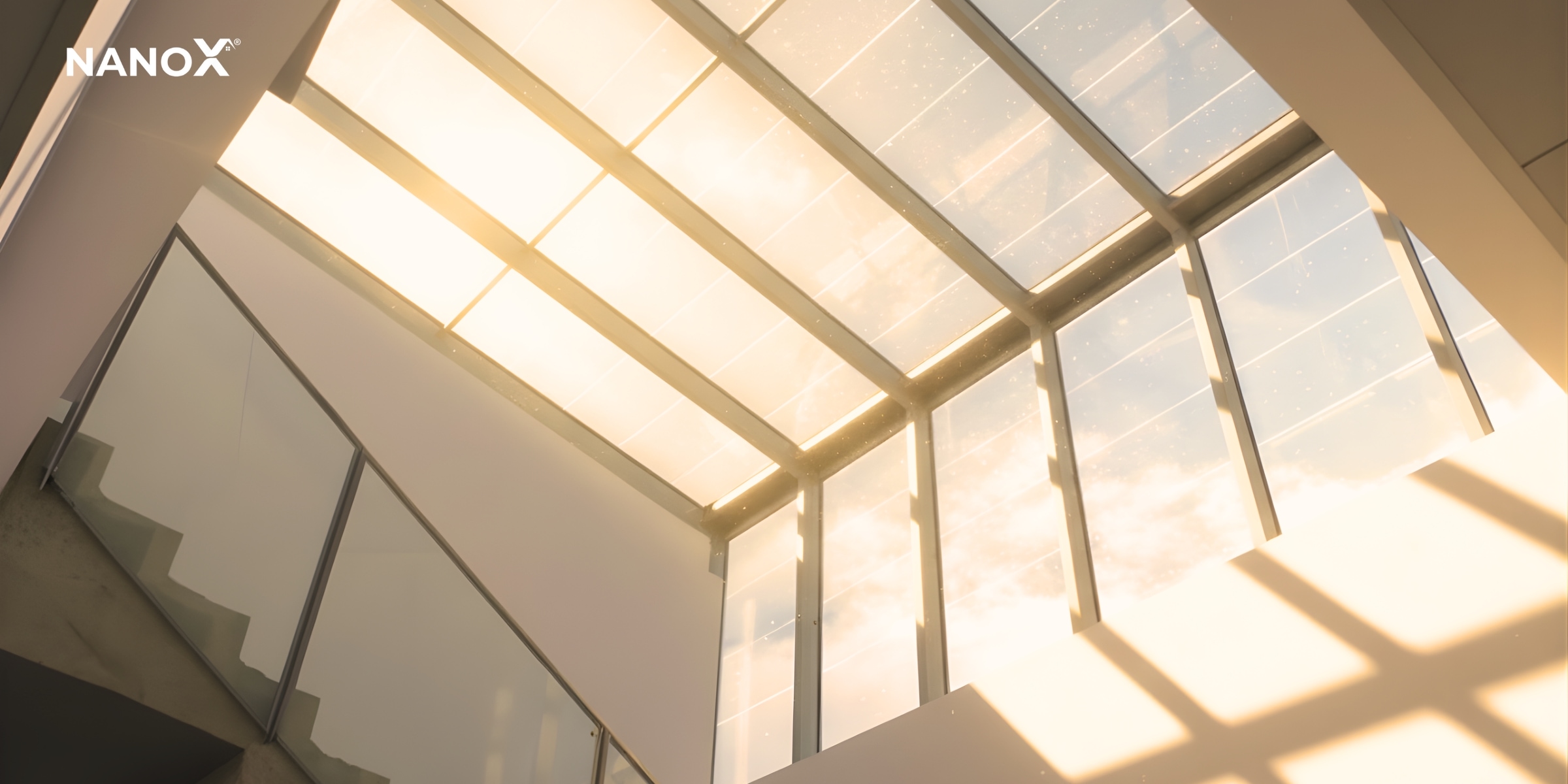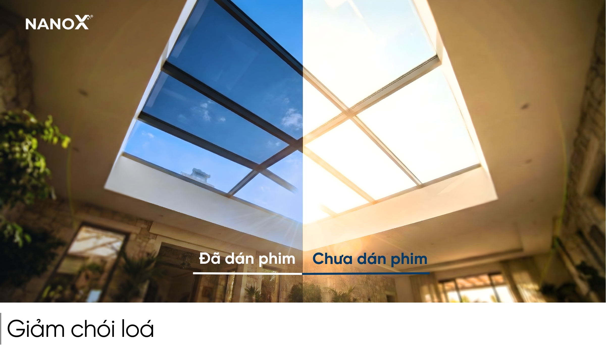 Ánh sáng chiếu thẳng qua giếng trời, mái kính thường có cường độ lớn, khiến không gian bên dưới chói lóa dẫn đến mỏi, chói mắt và khó chịu. Các dòng phim cách nhiệt NanoX có độ xuyên sáng thấp giúp cân bằng luồng sáng xuyên qua kính. Nhờ đó, làm dịu phần nắng gắt, giảm chói lóa và không gian vẫn nhận đủ ánh sáng tự nhiên.